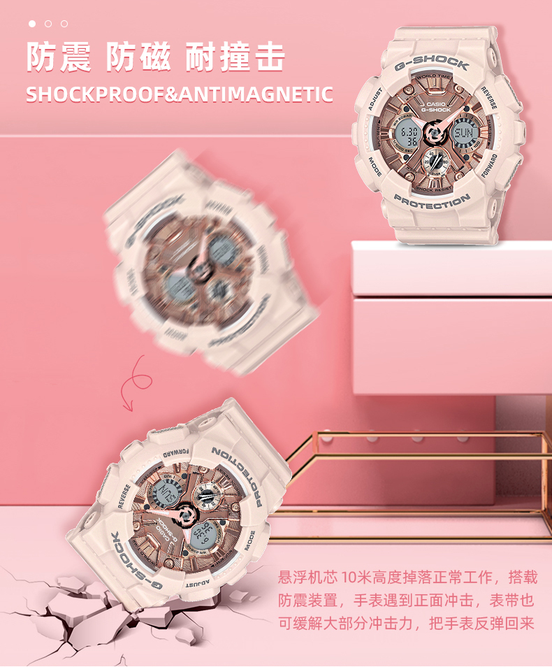 卡西欧手表官方女限量独白虎官网运动樱花粉GMA-S120旗舰店石英表